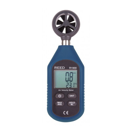 This compact air velocity meter (anemometer) measures in fpm, m/s, kph, mph and knots. The R1900 keeps track of maximum and average readings and features a data hold function and low friction rotating vane for improved accuracy.