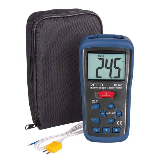 This single input type-k thermocouple thermometer features a large backlit LCD display and is capable of measuring -58 to 2000°F (-50 to 1300°C) and 223 to 2000 Kelvin. The R2400 includes a type-k beaded wire probe.