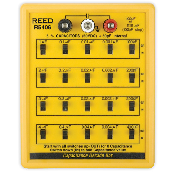 This capacitance decade box can be used to design and test circuits. The R5406 features slide switches that allow a user to easily add or subtract to quickly reach the desired capacitance range. Once tested, a capacitor size indicated by the decade box can then be put into the circuit.
