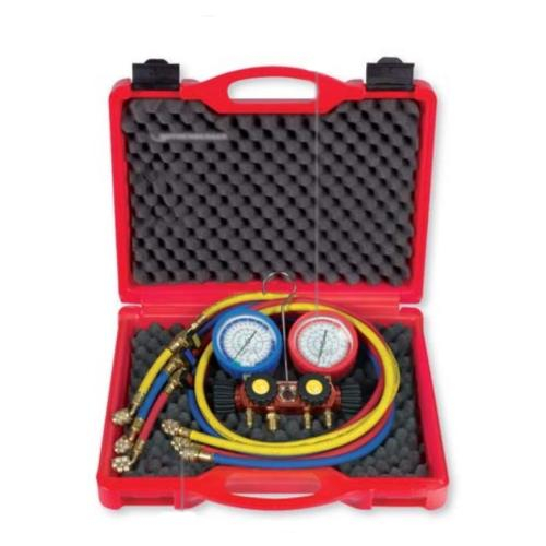 Set includes: Manifold, pressure gauge with Ø 80 mm, “Pulse-free“, class 1.6, 3 x 1,500 mm pressure hoses, plastic carrying case