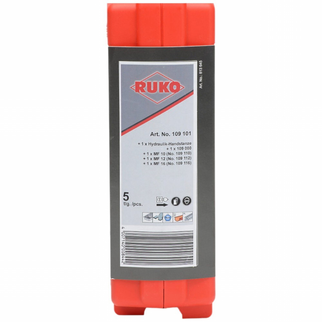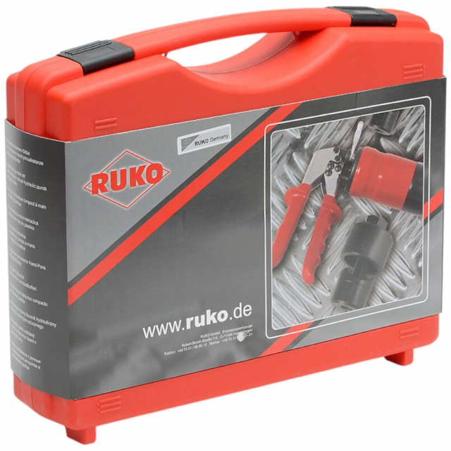 RUKO's squeeze-activated hydraulic knockout punch kit allows a user to quickly and precisely punch clean holes in sheet metal and plastic up to 5/32 inch thick. For use with RUKO knockout punches, sold separately.