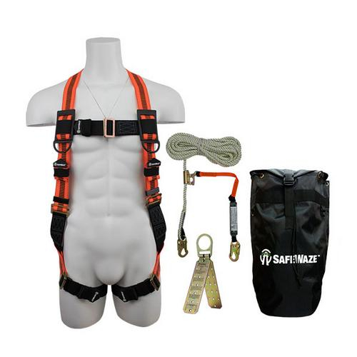 The SafeWaze V-Line FS-ROOF-E-BP Kit includes pass through legs harness, reusable roof anchor and rope lifeline packaged in a backpack.