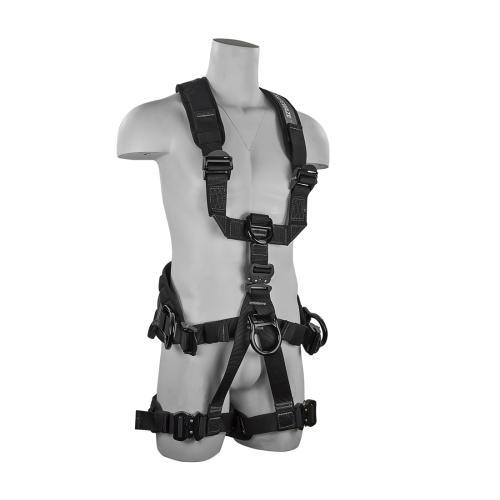 The SafeWaze Pro+ Premium Wind, Rope Access and Rescue Harness is specifically designed for Wind, Rope Access and Rescue workers. The unique design provides expansive flexibility and is loaded with features such as all aluminum hardware, front, rescue and suspension D-rings, side D-rings, quick release attachment buckles, unique quick release adjustment buckles, and extreme hip, back and shoulder padding.