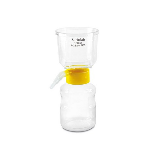 Sartolab RF are a new product line of disposable vacuum filtration units. The new Sartolab Receiver Flask (RF) units contain a high quality Sartorius PES membrane and combine highest flow-rates and throughput with extremely low protein binding and extractables. They are therefore the product of choice for filtration of tissue culture media, buffers, additives and other aqueous biologicals. They offer improved filtration speed and throughput and are therefore ideally serving the requirement of cost effective filtration.