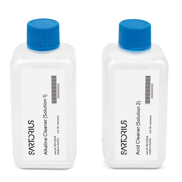 Two-stage cleaning kit for removing scaling and orga-nic contaminants. The alkaline substance contains non-foaming surfactants that dissolve orga-nic compounds, disperse colloids and can be quickly removed again from the membrane surface. Cleaning efficiency depends on the pH value that is steadily maintained by buffer substances through a large temperature range. The acidic cleaning agent to remove scaling contains chelate and reducing agents in order to dissolve metallic deposits. The ideal pH value also remains consistently low over a wide range during cleaning in this case thanks to the buffers.