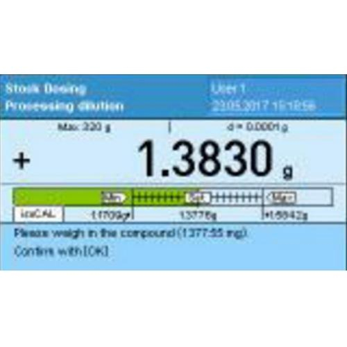 Features a database for solvents, components and samples and guides the user through the complete process of preparation of single or mixed standards of defined concentration. The solvent can be applied manually or with automated dispensers. Furthermore the application offers an interface for direct data transfer with the Thermo Scientific Chromeleon 7.2 chromatography data system (CDS) software. Standards of defined concentrations are used to determine the concentration of unknown samples. Such standards need to be prepared accurately in order to minimize errors during analysis of unknown samples. However, it is next to impossible to weigh a solid sample so precisely that you can use a predefined volume of solvent. With the new YAPP16 Dosing Q-App software installed, your Cubis MSA balance converts into an automated system for gravimetric monitoring of all measured values. The Dosing Q-App automatically adjusts the volume of the solvent to the weight of your compound and determines the verified final concentration of your standard solution based on the weight of solvent actually added. Time-consuming and error-prone manual preparation of standards using volumetric determination is now a thing of the past.