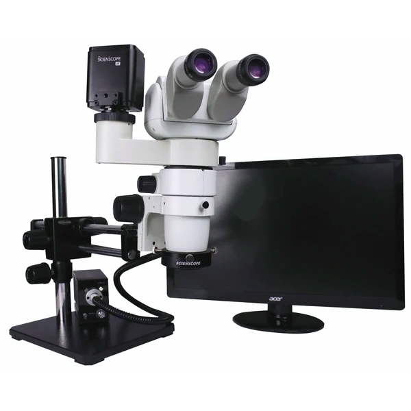 Scienscope, CMO-PK12-R3E-E, E-Series 0°-45° Tilting Binocular Head with 10x Eyepieces (Pair), 1:6 Zoom Body (0.8x-5x), 0.5x Achromatic Objective Lens, High Intensity Led Ring Light 4K HDMI/USB/Wi-Fi Autofocus Camera Includes SD Card, USB Cable and Mouse with 26" 4K Monitor and Capture Software