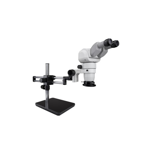 Scienscope, CMO-PK5D-E1-E, E-Series Microscope 0 Deg-45 Deg Tilting Binocular Head with 10x Eyepieces, 1:6 Zoom Body (0.8x-5x), 0.5x Achromatic Objective Lens, Compact LED Ring Light, 76mm Focus Mount, and Dual Arm Boom Stand