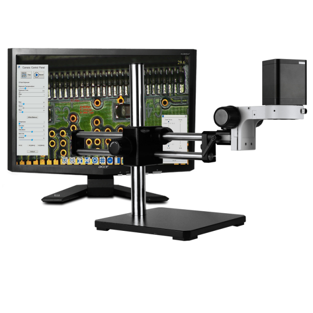 Scienscope, MAC-PK5D-A1-4K, 4K All-One Camera Digital Inspection Systems with Integrated Optics (80x Max) and Integrated Diffused Led Ring Light and Mounting Adapter. SD or USB Card Capture. Includes 27-28" UHD LCD Monitor and Capture Software. Dual Arm Ball Bearing Boom Stand. Includes FOV Measuring and Annotation Toolbar with Preloaded Calibration Files