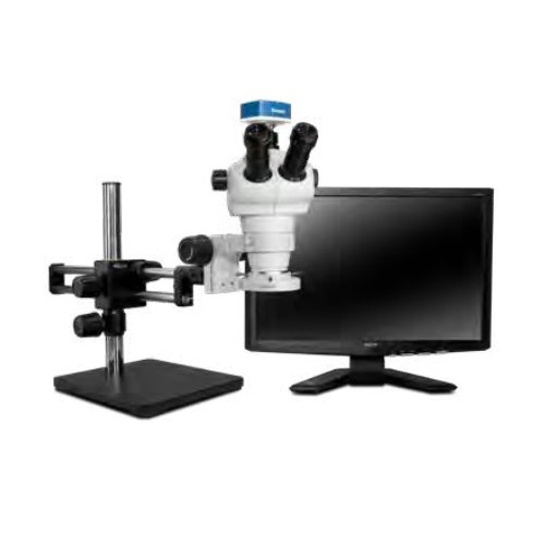 Scienscope, NZ-PK10-R3E, NZ Microscope Stereo Zoom TRUE Trinocular, 10x Eyepieces, Eye Guards, Dual Arm Boom Stand with 76mm e-Arm, 0.5x Auxiliary Lens, 0.4x Video Coupler, Super-Bright Low-Profile LED Ring Light
