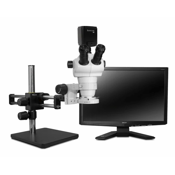 Scienscope, NZ-PK12-E1, NZ Stereo Zoom True Trinocular, 10x Eyepieces, Eye Guards, Dual Arm Boom Stand with 76mm E-Arm, 0.5x Auxiliary Lens, 0.4x Video Coupler, Quadrant Compact LED Ring Light, 4K HDMI/USB/WIFI Autofocus Camera (Includes SD Card, USB Cable and Mouse) with 26" 4k Monitor and Capture Software