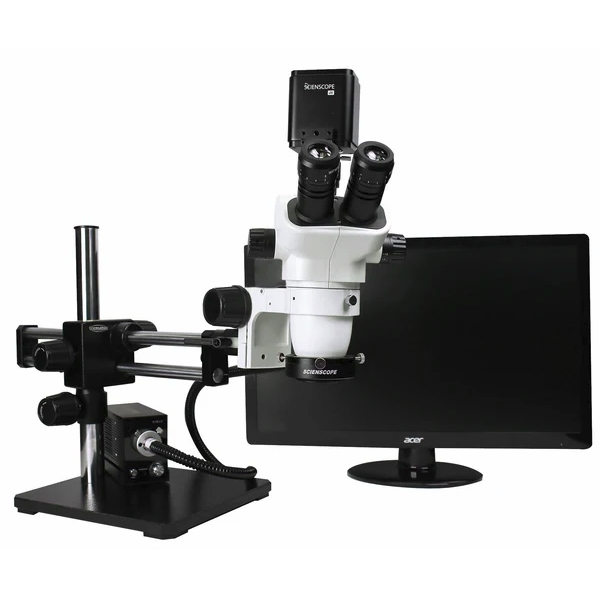 Scienscope, SZ-PK12-R3, SZ Stereo Zoom True Trinocular, 10x Eyepieces, Eye Guards, Dual Arm Boom Stand with 76mm E-Arm, 0.5x Auxiliary Lens, 0.5x Video Coupler, High-Intensity LED Right Light with Polarizer, 4K HDMI/USB/WIFI Autofocus Camera (Includes SD Card, USB Cable and Mouse) with 26" 4k Monitor and Capture Software