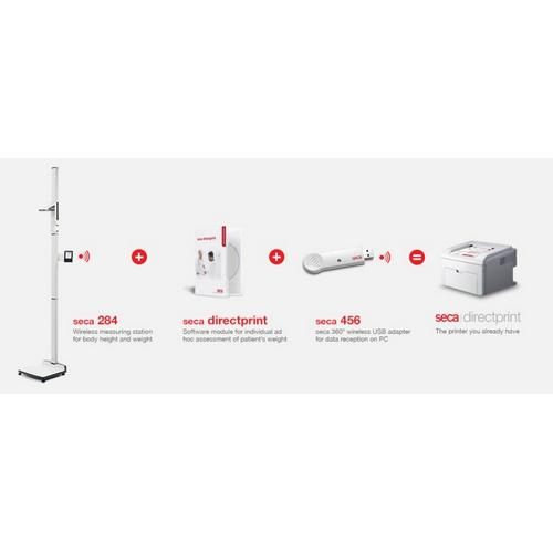 The 360 deg; measuring station seca directprint 284 measures and weighs in a single step. Other benefits include the high-capacity scale integrated in a slip resistant glass platform with an anti-tip column design, heel positioner and the solid headpiece with the integrated seca Frankfurt Line - for precise head positioning. The seca directprint 284 is equipped with two displays, one is for a direct read-out of height from the headpiece and the other, a three-line multi-function touch display that shows height, weight and the automatically calculated BMI. On top of all that, the scale shows the slightest weight changes with its fine 50-gram graduation and wirelessly transmits all measurements via the seca 360 deg; wireless.