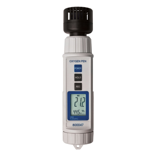 Reads oxygen in air for environmental studies, IAQ, bio-technology (for oxygen incubators and anaerobic cultivators), food storage and refrigeration, and testing fire alarm and fuel cell systems. The fast, highly reliable, galvanic oxygen sensor is unaffected by acidic gases such as CO2. Simultaneously displays O2 concentration and air temperature in ®C or ®F. Features hold, min/max, a low battery indicator, ATC and auto-power-off.