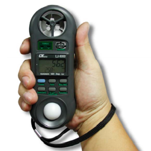 For environmental testing anywhere. Combines an anemometer, hygrometer, thermometer, and a light meter into a single compact unit weighing only 5.3 oz (150 g). Features dual display with low battery and over range indications, touch-tone buttons, min/max, auto power off and hold functions.