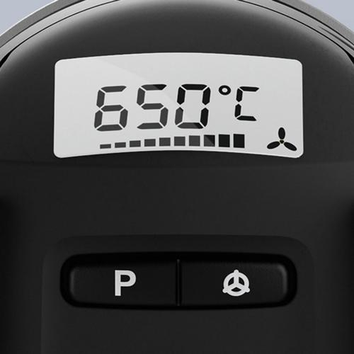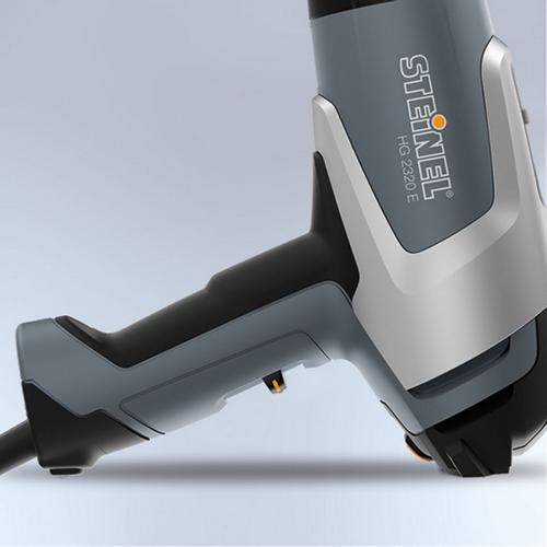 Precision digital control. Electronically controlled HG 2320 E hot air tool. 2300 W, digital temperature setting by joystick from 80 – 650 °C, temperature indicated in 10 °C steps on LCD display. Airflow regulation in 2 stages of 150 and 500 l/min.