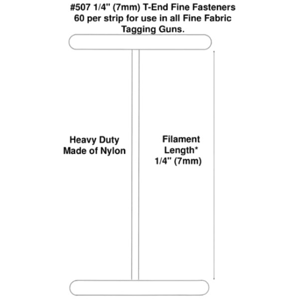 Tach-It #507 T-End Micro-Spaced Heavy Duty Nylon Tagging Fastener for use in most fine fabric tagging tools, including #TI2F Fine Tach-It 2 Tool and Micro-F Micro-Mini Fine Tagging Tool. This Fastener is 1/4 (7 mm) inch long and has 100 fasteners per clip.