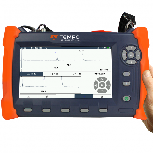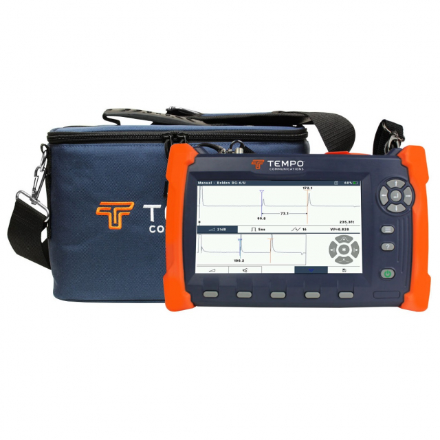 CableScout® TV90E offers a balanced mix of automation and manual testing that enables technicians to do their jobs right the first time. The TV90E delivers the latest TDR technology in a small, lightweight and rugged design to provide unrivaled ease-of-use and coaxial cable testing performance as well as telephone or Ethernet twisted pairs. With the TV90E, technicians will spend less time operating the TDR and more time repairing faults. Simply select the cable type to be tested and the TV90E does the rest. Pulse width, VP, gain, and vertical position are automatically selected and adjusted as you scan the cable. The TV90E employs optimized pulsing and sampling, coupled with advanced filtering and signal-processing techniques you always have the cleanest possible waveform for the easiest event identification. The FastFind™ automatic fault locator function can quickly adjust the overview trace to the last fault on the cable speeding documentation of faults in real-time. The TV90E is the latest member in the long line of TDR's from Tempo Communications, and builds upon the success of some of the most trusted TDR's in the industry.