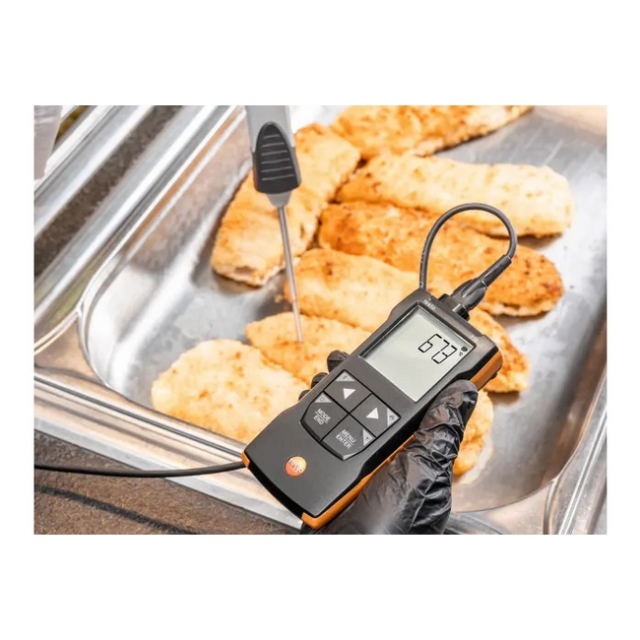 Easy to use and precise in measurement: This is how the compact temperature measuring instrument testo 110 convinces every day in use. The fast temperature all-rounder can show its strengths particularly in applications in laboratories or in the food environment: The optionally available NTC or Pt100 probes cover a comprehensive range of measuring tasks and ensure exact results with particularly high accuracy. The digital Pt100 probes can also be calibrated without the measuring instrument - so you can easily continue working with a different probe without downtime.Of course, the testo 110 is HACCP-compliant, certified to EN13485 and, with the optional TopSafe protective cover, dust-tight and protected against water jets (protection class IP65). The temperature measuring instrument is rounded off by the testo Smart App for smartphones and tablets:
