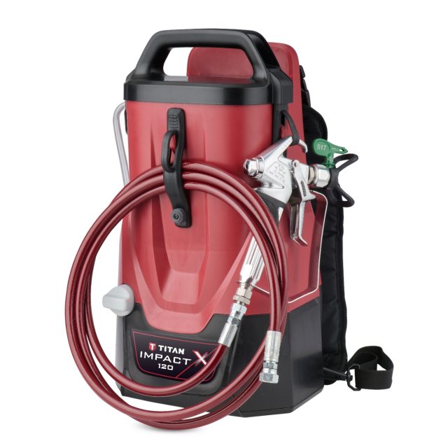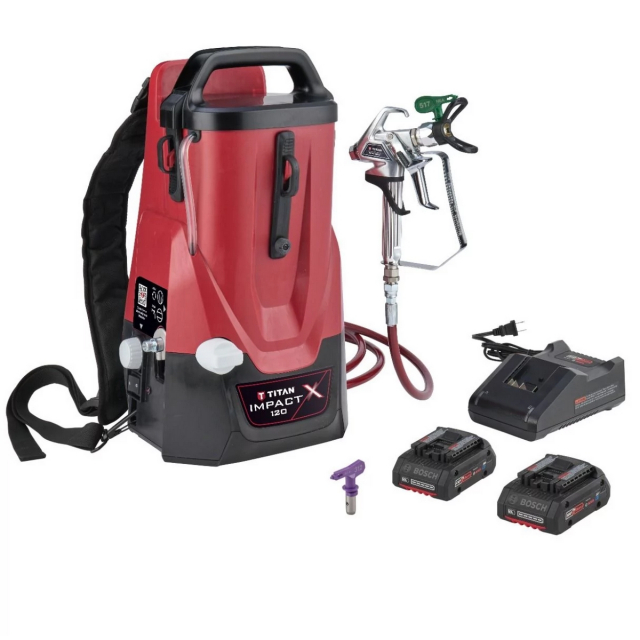 Step up to industry-exclusive portability, flexibility, and comfort with the Impact X 120. Optimized for Low Pressure Airless use and featuring three operational configurations so you're ready to go no matter what the job calls for. Powerful AMPShare™ by Bosch® 4Ah battery delivers up to 1400 square feet of coverage per charge on a single battery system that works across multiple Titan sprayers.