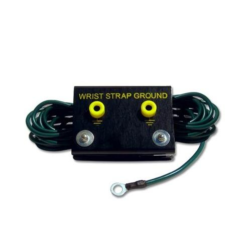 CP4070 Metal Bench Mount Common Point Ground (CPT) offers the common ground point required by ANSI/ESD S-6.1 and ANSI/ESD-S20.20. The metal enclosed box mounts under front edge of workstation. Includes a 15' long ground cable with #10 ring terminal connector. Two banana jack receptacles for secure ground con-nections. Two parking studs (4mm) for storing cords when not in use.