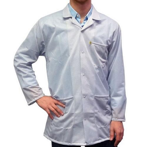 JKC 9023SPWH provides high quality ESD protection and made from a light-weight blend of 90% polyester and 10% conductive fibers. It features a snap front closure with a lapel-style collar and also has wrist-adjustment snaps and three roomy patch pockets.