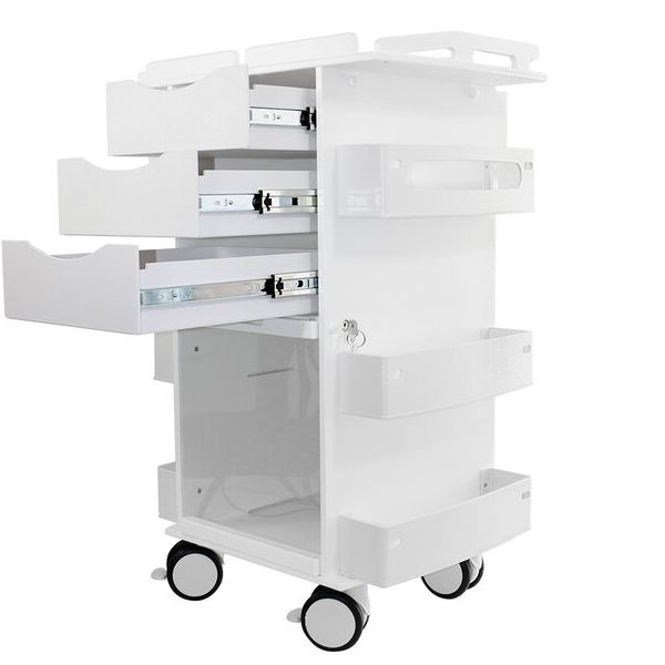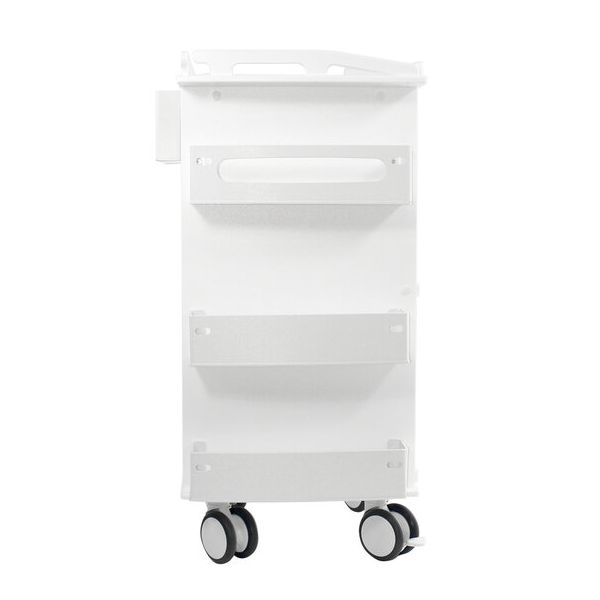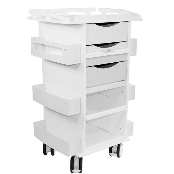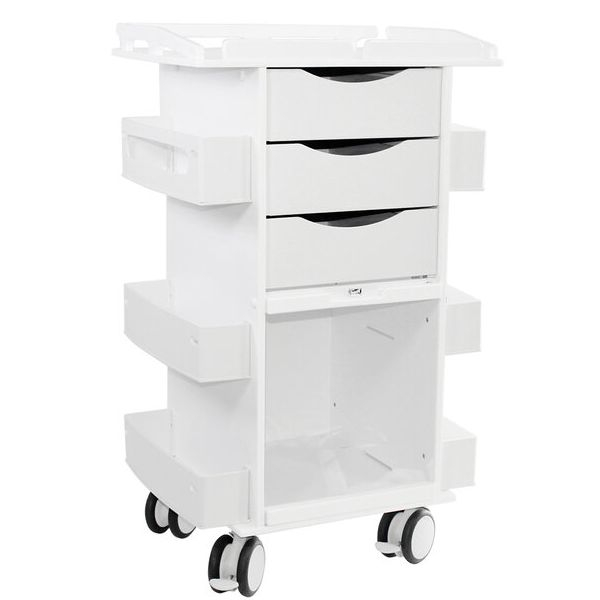 TrippNT's Core DX Cart with Sliding Door and Railtop organizes, stores, and secures supplies. It offers a 1-inch railtop for secured top storage, 3 drawers, 4 shelves, 2 dispensing shelves, and bulk storage with a sliding clear door. It's built-in handles are ergonomic and easy to grab and the sliding door offers a smaller usage footprint. It is constructed from a corrosion-resistant non-metal rust proof polymer with robust 4-inch twin wheel casters capable of easily navigating elevator gaps and uneven surfaces. Ships fully assembled. All TrippNT products are made in the USA and come with a 100% Total Replacement Lifetime Guarantee.