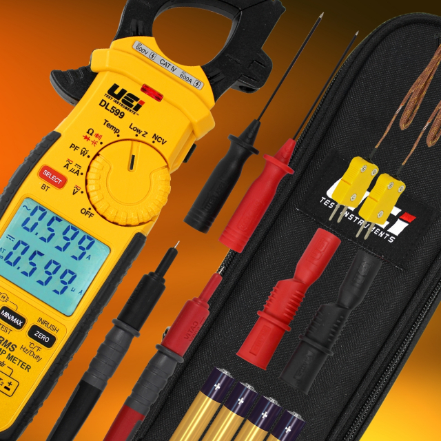 The UEi DL599 is an award-winning wireless 600A True-RMS HVAC/R clamp meter now offering Power Factor and Watt measurements. This flagship solution can wirelessly connect to a free App for logging, graphing and emailing results and features a 600A clamp capable of AC/DC amps and frequency readings. Each meter includes a set of silicone test leads, 2 K-Type thermocouples, threaded back probes for testing molex connectors, threaded alligator clips for hands-free testing, and a zippered carrying pouch.