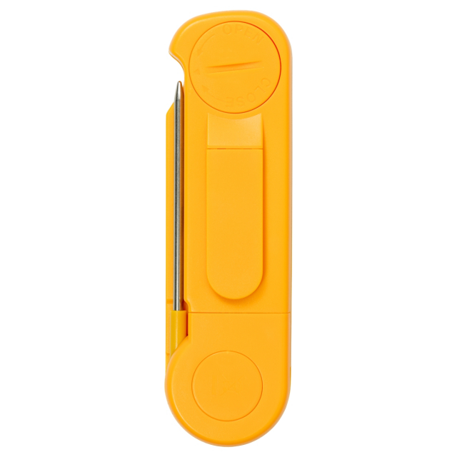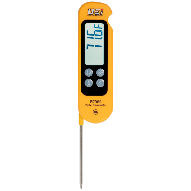 The UEi PDT660 is an NSF listed side-folding digital pocket thermometer. This compact thermometer is perfect for the food service industry with its bright backlit display, convenient pocket clip, and a folding probe capable of reading in any position.