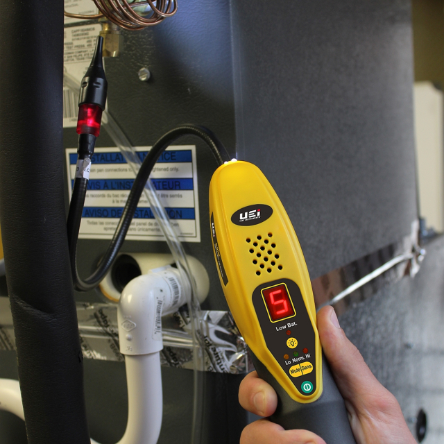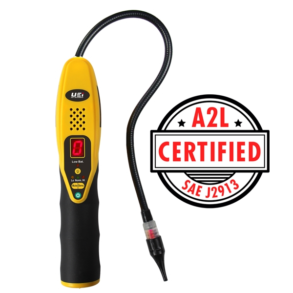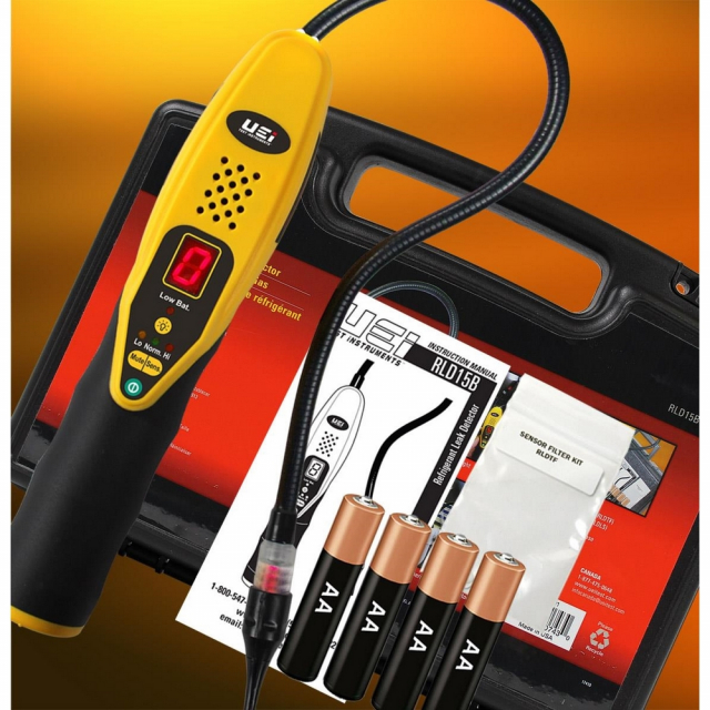 The UEi RLD15B is an A2L certified refrigerant detector. Equipped with a heated sensor to increase accuracy and reduce false alarms, the RLD15B displays approximate leak sizes with the digital leak size indicator to help pinpoint leak sources. Finally, the mechanical pump draws gas over the sensor faster providing a quick response in a variety of contaminated or windy environments