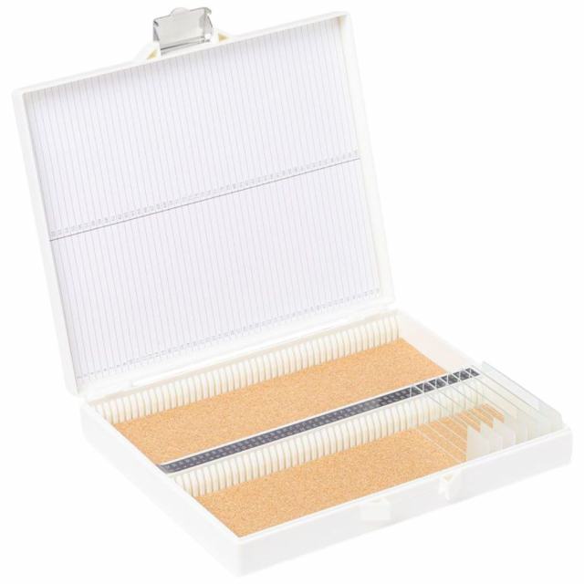Designed as a convenient solution for temporary storage and transferring of microscope slides . The bottom is lined with a cork pad, and the lid has a printed index for quick reference.