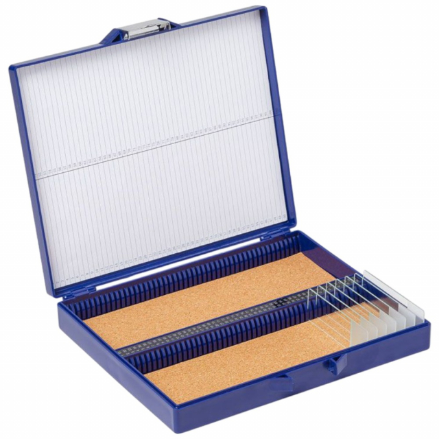 Designed as a convenient solution for temporary storage and transferring of microscope slides . The bottom is lined with a cork pad, and the lid has a printed index for quick reference.