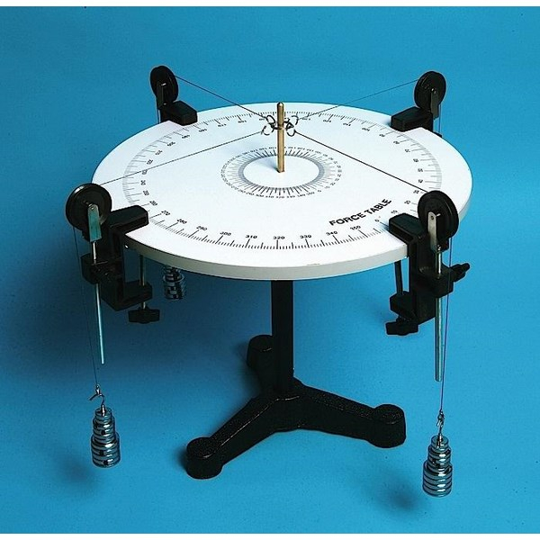 This student force table is a complete set that features a dual scale, allowing students to take readings either clockwise or counterclockwise, four complete weight sets (each with brass slotted weights, 2 x 5g, 4 x 10g, 4 x 20g, and a 20g brass weight hanger), four pulleys with clamps and two sets of strings that allows students to investigate the equilibrium of either three or four forces. A bubble level helps students with the setup, and the 16" diameter lightweight, durable table top and sturdy cast iron support allow both ease of use and accuracy. Includes activity guide.