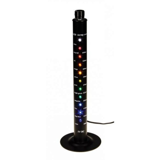 The vertically-aligned set of LEDs make an easy and dramatic demonstration of the relationship between the color and wavelength of light. The spectral range of each LED can be investigated with a spectrometer, or just viewed for comparisons with each other and with the "white" LED spectrum. Each LED can be turned on individually with the rotary switch on the top of the column. Includes power supply.