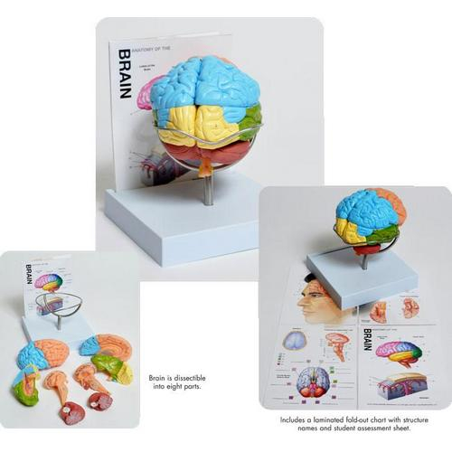 Eight-part full-sized brain molded from PVC plastic, and hand-painted to show lobes. Includes over 50 labeled structures of the brain. Mounted in a rotatable metal wire harness on a plastic stand. Includes a fold-out laminated color guide indicating brain structures. One side of the guide includes structure names. The other side includes only numbers so it can be used for student assessment. Fold-out guide rests in a slot molded into the plastic base.