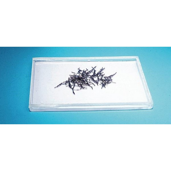 Iron fillings sealed in a transparent plastic case that measures approximately 90mm x 65mm x 6mm.