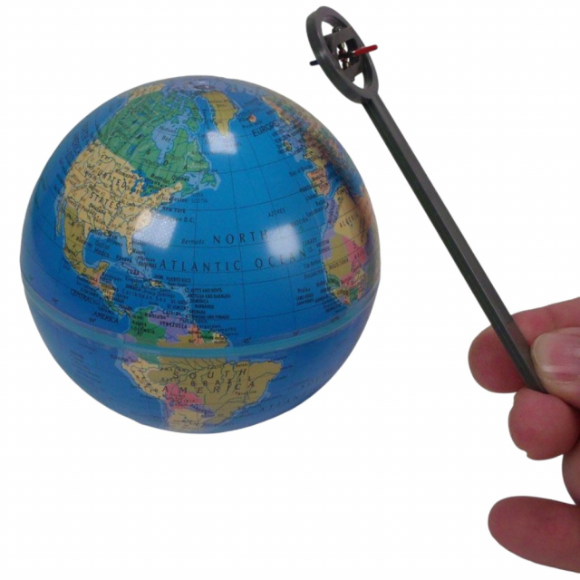The Earth acts like it has a huge bar magnet located at its center. This set contains a globe that is 110 mm wide with a magnet contained along its axis. The magnaprobe contains a small magnet that is allowed to rotate on two axes. This set illustrates the path of the magnetic field along the surface of a globe. The closer to the poles, the steeper the angle of the magnetic field. This is useful in demonstrating the large magnetic field that exists on the Earth. The activity guide contains information about the Earth's magnetic field, Van Allen belts, and the northern lights.
