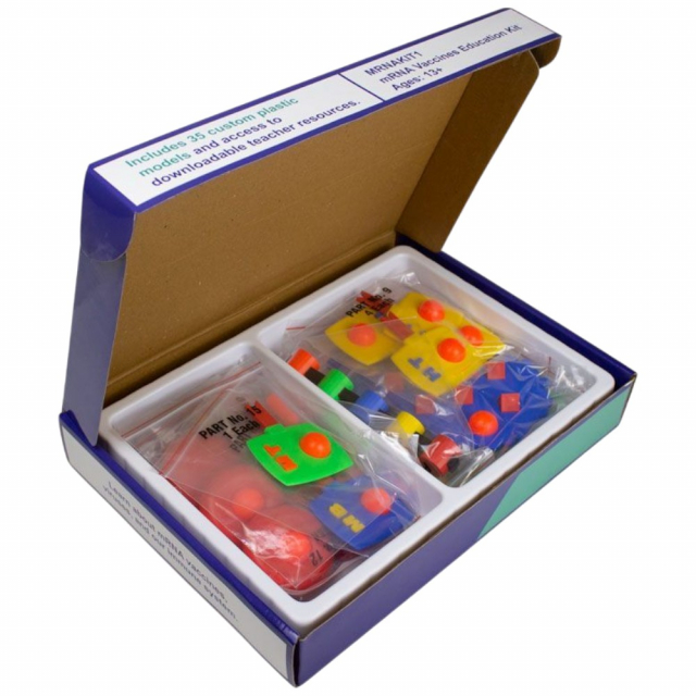 This mRNA kit is designed to aid in the teaching of how mRNA vaccines provide immunity against harmful viruses. A colorful animated slide show illustrates virus structure, viral entry into body cells and the immune response. A summary of how mRNA vaccines are produced and why they provide lasting immunity without causing sickness follows.