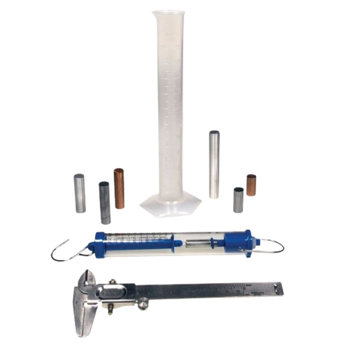 This unique kit allows students to make a wide range of investigations with only a small number of items. The kit contains two sets of three metal cylinders - aluminum, copper, and steel. In one set the cylinders all have equal masses, and in the other they have equal volumes. The measuring instruments - cylinder, spring scale, and caliper - measure volume, mass, and length. This combination of items allows for a wide range of basic investigations, addressing the concepts of mass, volume, density and specific gravity and extending to an exploration of buoyancy.