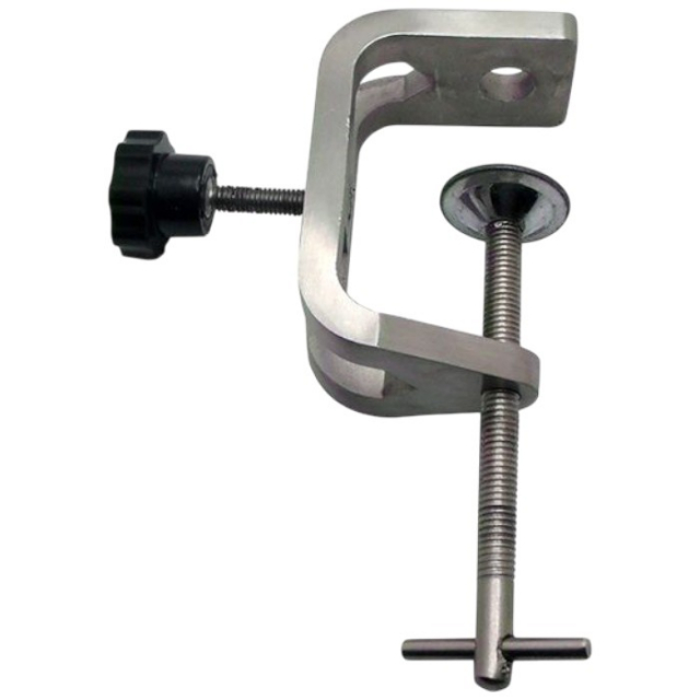 Stainless steel support clamp for lab tables. Hold support rods securely to any table edge up to 5.6 cm (2.2") thick. The set screw allows for easy adjustments to hold support rods at various heights.