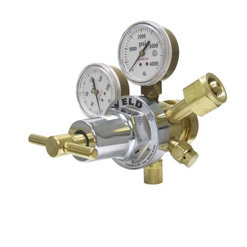 The Uniweld RUH8218-2 is a medium/heavy duty single stage air regulator with a machined brass body, polished chrome bonnet, and easy to read single scale single, 2 inch, 0-4000 PSI Contents Gauge (Part No. G7S) and 0-200 PSI Delivery Gauge (Part No. G4S). The regulator has a CGA346 inlet connection, Left Hand 5/8 inch -18 Female outlet connection, with a delivery pressure of 5-125 PSI. Product also includes an externally serviceable pressure relief device (PRD) which protects the regulator. The PRD is not designed to protect the downstream equipment. Uniweld single stage regulators are used for general purpose applications where nominal delivery pressure changes, due to decreasing Cylinder pressure, do not affect operations. Single stage regulators have greater flow capacity than two stage models. Made in U.S.A.