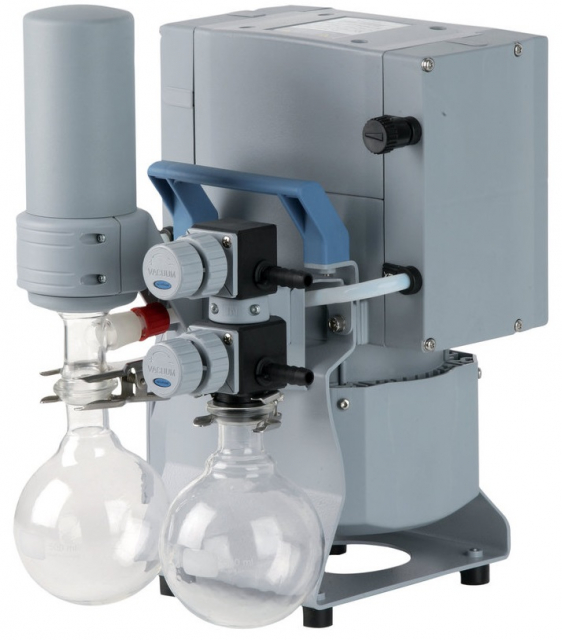 This chemistry vacuum system provides the simultaneous operation of two processes with only one pump. Typical applications are rotary evaporators, vacuum concentrators and vacuum drying ovens. Each vacuum connection is provided with a manual valve to regulate the effective flow at each port. The MD 4C NT pump offers more than sufficient pumping speed also for the parallel operation of two challenging applications. The separator at the inlet (AK), made of glass with a protective coating, retains particles and liquid droplets. The waste vapor condenser at the outlet (EK) is highly efficient and compact. The condenser enables near-100-percent solvent recovery, efficient recycling and active protection of the environment. Pumping unit completely mounted, ready for use, with manual.