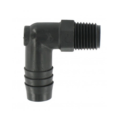 1/4" MPT x 1/2" Barb 90 Deg Elbow Black Male Adapter