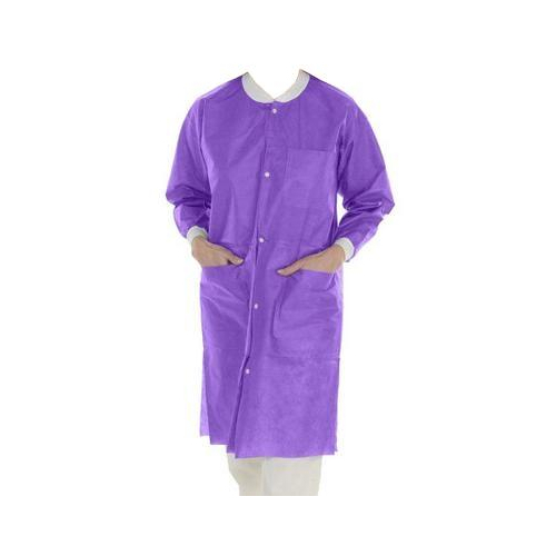 Durable unisex lab coat made for protection and comfort with SMS material that is fluid resistant, highly breathable, and fire retardant.