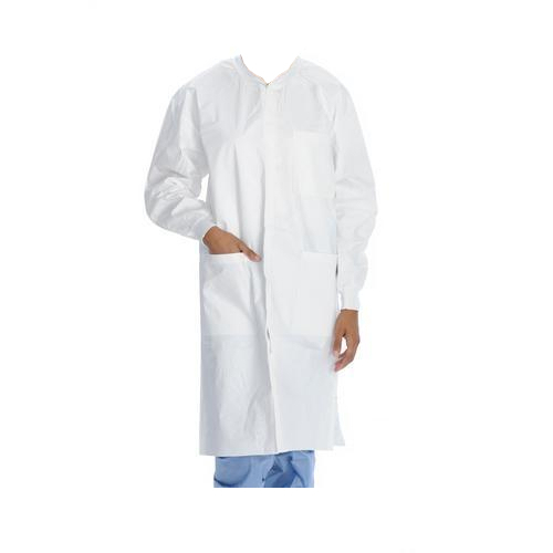 Durable unisex lab coat made for protection and comfort with SMS material that is fluid resistant, highly breathable, and fire retardant.