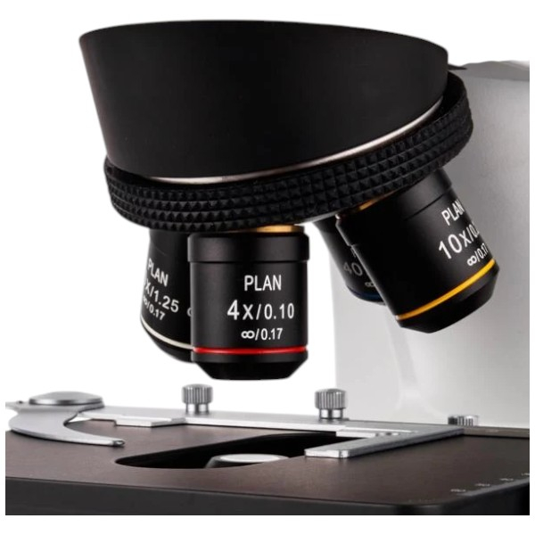 - Objective: 4X, 10X, 40X (S) and 100X (S) (oil), infinity corrected plan achromatic optics and color ring for easy identification.