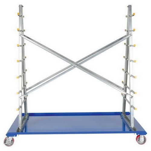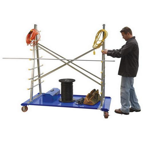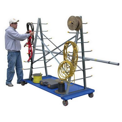 The portable A-Frame Storage Cart with storage rack is ideal for storage and transporting pipe, conduit and other types of bar material. Storage arms extend beyond frame. Unit rolls on swivel casters that include brakes. Base is powder coat blue while the storage rack is zinc plated.