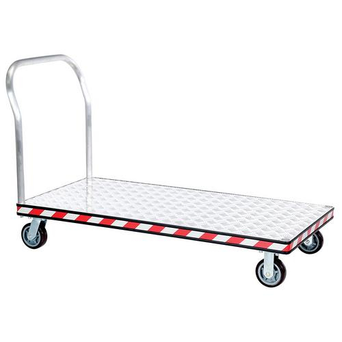 Heavy duty, extra strong, corrosion resistant platform trucks are ideal for handling all types of materials. Non-slip 5 bar aluminum tread plate. Box style frame is made of high strength welded aluminum channel. Removable aluminum handle can be placed on both or either end of the platform truck. Ergonomically designed to reduce the chance of injury, fatigue and muscle strain. Fitted with non-marking rubber protective buffer strip to protect walls and door frames during transit. Two (2) swivel and two (2) rigid 6" x 1-5/8" poly-on-poly casters. Ideal for supermarkets, food industry, schools and warehouses.