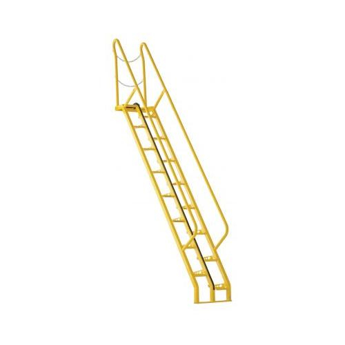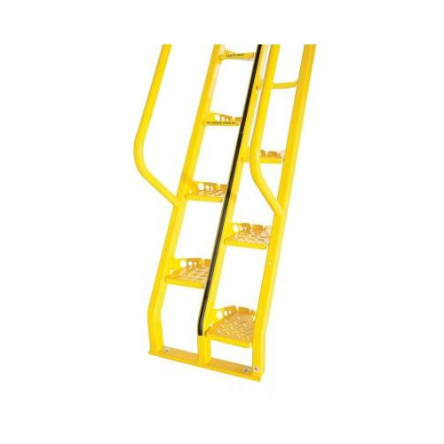 Alternating-Tread Step design offers a shorter span than traditional steps. Features handrail on each side of unit, dual safety chain at the top of the stair and formed steel steps with raised surfaces for better traction. Welded steel construction with bolt-on handrails. Baked-in powder coat finish for added toughness. Meets OSHA specification 29 CFR 1910.25. Ships knockdown for lower freight costs.