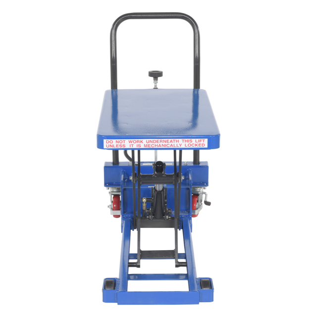 In areas of congestion a low profile scissor cart is a must. With a two speed foot pump, the platform is easily raised/lowered to the desired position. Not only is this design extremely efficient but also ergonomically friendly. With a raised steering handle the user can maintain a proper working posture during transit. The sleek steel design, with a powder coated finish for baked in added toughness, is simple to clean and limits needless scuffs or abrasions. Mold on rubber casters with brakes roll easily over a variety of surfaces.